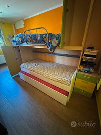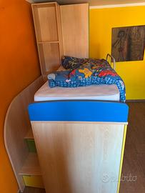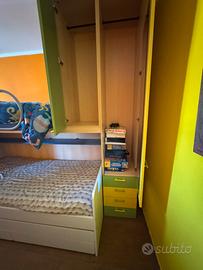 NB Letto singolo in foto NON DISPONIBILE Vendo cameretta a ponte con letto matrimoniale e letto singolo Scala con 3 sportelli cassettiera Struttura Letto Matrimoniale Armadio con 2 ante Struttura color Larice Ante verde e giallo