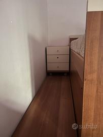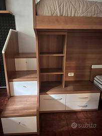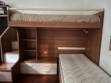 Vendesi cameretta a ponte/soppalco. Letto a castello. Due letti. Misure complessive (incluso letto sotto): 247x251cm. Misure senza letto sotto: 137x251cm. Prezzo trattabile.