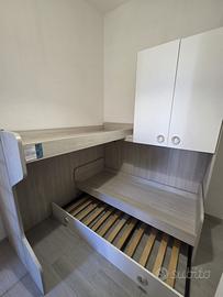 Vendo cameretta a ponte nuovissima, come da negozio, misure 205 x205 cm. Come da foto il terzo letto é dentro il cassettone e trasforma il letto ad una piazza in letto matrimoniale.
