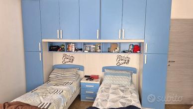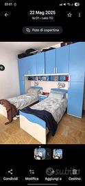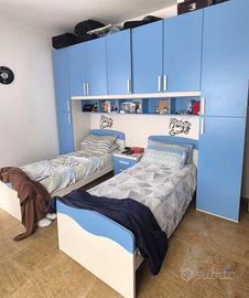 cameretta a ponte colore blu avio, sette ante battenti, quattro cassetti interni più comodino con tre cassetti, semi nuova in ottime condizioni, smontaggio e trasporto a carico dell'acquirente, misure L 3.5 MT x P 58 cm x H 2.60 MT (materassi non compresi) no perditempo no trattabile
