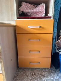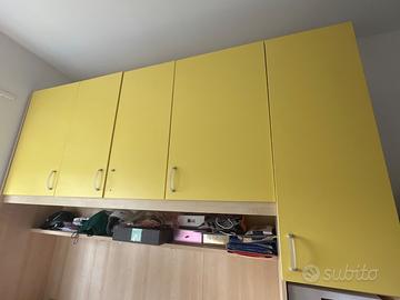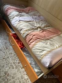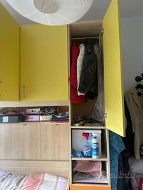 Vendo cameretta a ponte. C’è un letto singolo, con due cassetti sottostanti. Sopra ci sono quattro armadietti con tre ripiani e poi ce n’è uno più alto sopra i cassetti a lato del letto.