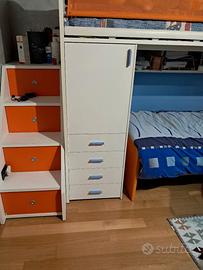 Colore: Struttura principale bianca, dettagli e rete di protezione arancione, vano letto inferiore azzurro.