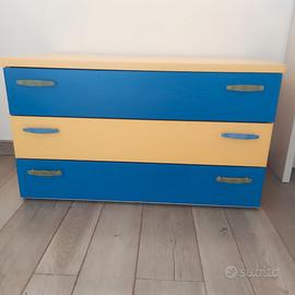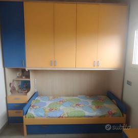 Cameretta composta da una cassettiera e mobile a ponte con due letti. Il mobile a ponte è largo 255 cm e alto 262 cm. In caso di necessità la parte del letto che è larga 210 cm (la parte con le 4 ante gialle) può essere separata dall'altra parte del mobile (con alta blu sopra e 4 cassetti sotto) che è larga 45 cm. La cassettiera è larga 90 cm e alta 53 cm. Il prezzo include anche 2 materassi per ognuno dei letti. Pronta smontata, solo il ritiro a carico dell'acquirente.