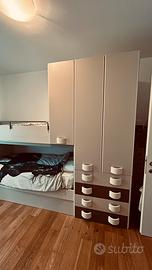 Vendo cameretta a ponte beige e marrone , lunghezza 318cm larghezza 90 cm ,altezza 235cm.Comprese nella cameretta due reti e un materasso. Trasporto a carico dell’acquirente.