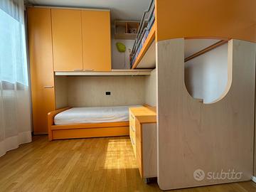 Composta da letto con secondo letto estraibile, letto rialzato scorrevole con scalatta a cassettoni, cassettiera con ruote (L 90 cm) scrivania con cassettiera (L 135 cm) due librerie (L60 H64 cm) un modulo a giorno (L120 cm) .