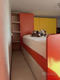 Cameretta di qualità marchio MISTRAL La camera è composta da un armadio capiente, un comodino, tre letti di cui uno soppalco, scala e contenitori a botola, scrivania più sedia con rotelle