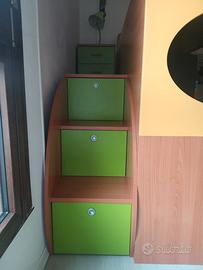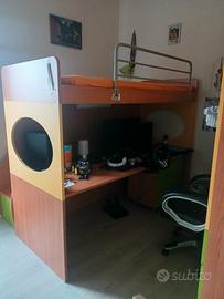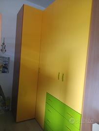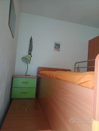 vendesi cameretta con armadio ad angolo dimensioni p.60, lunghezza 190,larghezza.104.5 ,h 2,5 /libreria lunghezza 89, h 2.45,p.60,letto a soppalco su scrivania con scaletta con cassetti interni e cassettiera larghezza 1,34.5 ,lungh.2,05 ,h 1.65 compreso eventualmente di materasso