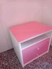 Vendo, per inutilizzo, ampia cameretta su due lati ad angolo di metri 2 (lato letto) x 2,95 (lato armadio), composta da armadio con 3 cassetti nella parte bassa, letto amovibile (quindi facilmente spostabile) e 4 spaziose ante superiori, di cui 2 angolari. Sotto il letto può essere aggiunta un’ulteriore toga con materasso, essendo già disponibile la relativa copertura provvista di staffe per il fissaggio. La cameretta, sebbene prevista per una bambina, essendo quasi completamente bianca, è facilmente adattabile ad un bambino attraverso la semplice sovrapposizione – sulle fasce colorate – di una pellicola di colore diverso a proprio piacimento. Eventualmente acquistabili separatamente, in quanto non facenti parte della cameretta, sono: Comodino in legno verniciato per la parte bianca e pellicola colorata per la parte rosa ad euro 20; Contenitore verniciato per la parte bianca e pellicola colorata per la parte rosa (interno marrone) ad euro 20. La cameretta è visionabile senza impegno previo appuntamento e si è disponibili ad inviare ulteriori foto maggiormente dettagliate.