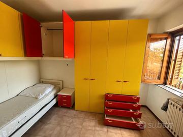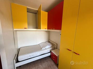 vendesi cameretta angolare seminuova, completa di letto, materasso e comodino; lato letto 210cm, lato armadio 345cm, altezza 262cm