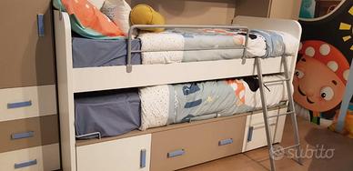 Vendo cameretta angolare completa, in condizioni ottime! 2 materassi, una scrivania con 2 sedie, 2 mensole , 2 bariere. Possibilmente i 2 letti che diventano un letto matrimoniali.