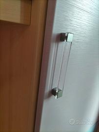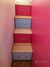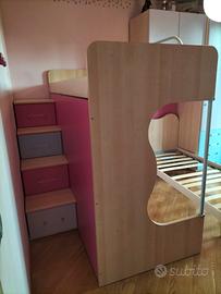 Cameretta angolare con soppalco con due letti singoli compresa di comodino e scrivania, colore legno chiaro rosa e lilla. Ha una doga del letto mancante. altezza MT 2,28 larghezza MT 3,20 profondità MT 2 N.B. : NO SPEDIZIONE