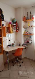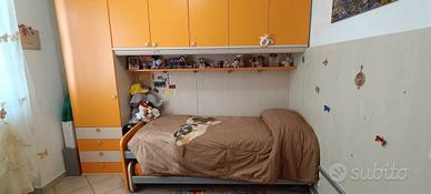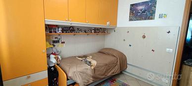 Colonna libreria con 4 cassetti: altezza 227 cm, larghezza 48 cm, profondità 33 cm Scrivania: lunghezza 105 cm (senza sporgenza), 135 cm (con sporgenza), profondità 50 cm (parte ondulata corta), 64 cm (parte ondulata larga) Camera: larghezza 285 cm (compresa di colonna con cassetti), altezza 262 cm, profondità 57 cm - Colonna con cassetti: altezza 262 cm, larghezza 60 cm, profondità 57 cm - Ante sopra letto 96 x 45 cm - Parete testata letto con guide, due letti scorrevoli apribili fino a 217 cm - Rete adibita a contenere materassi di 80 x 190 cm Smontaggio e trasporto a carico dell'acquirente. Prezzo trattabile