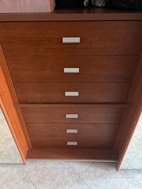 Vendesi armadio 3 ante completo di cassettiera a 6 cassetti nell’anta centrale e appendiabiti in tutte le ante. Letti come da foto compelti di 4 cassetti e letto inferiore estraibile.