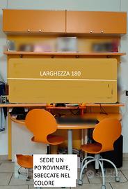 Zona studio: Ampia scrivania sagomata (L 180 cm) con cassettiera, mensole e pensili coordinati. In regalo due sedie arancioni (con segni di usura).