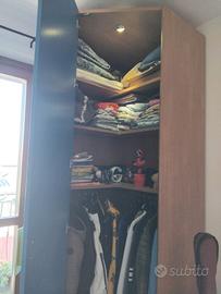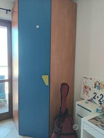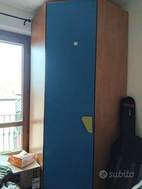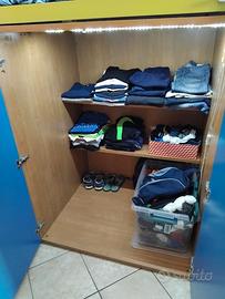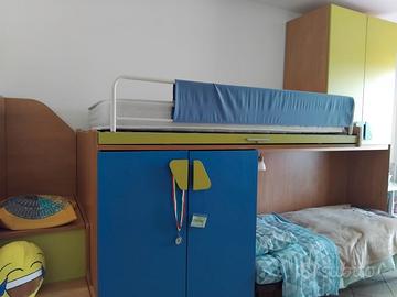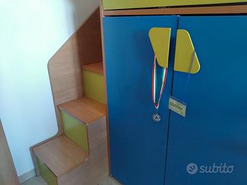 Cameretta bimbo/a ben tenuta 2 letti, cabina armadio illuminata, lunghezza 365 cm più 102 di cabina armadio eventualmente da mettere su una parete unica o staccata. Altezza 259 cm. Scale contenitori per accedere al letto superiore! Made in italy