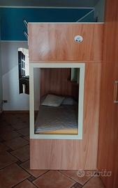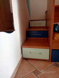 - letto a castello ( due letti singoli 2 m , 45 lunghezza x 1,39 di larghezza ), scale laterali con cassetti contenitore e cassettone contenitore.