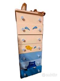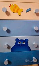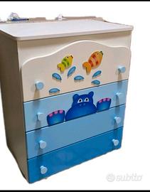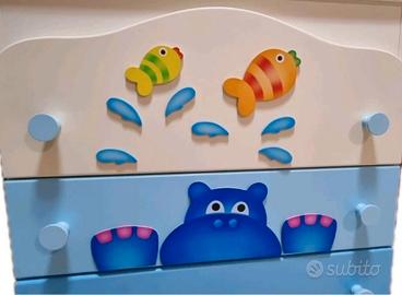 Cameretta Azur modello Ippopotamo Per Bambino, composta da lettino con Oblò, copriletto a tema, fasciatoio e cassettiera. Possibilità di consegna a domicilio a pagamento nel raggio di 100km.