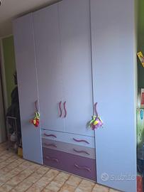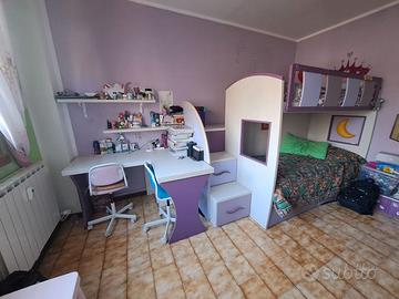 Cameretta bimba/ragazza composta da due letti a castello con scala e corridoio, scrivania ad angolo, mensole e ampio armadio a 4 ante con cassettiera. Le scale, il letto e il corridoio hanno ulteriori cassetti e botole. Inclusi nel prezzo i due materassi memory e le due sedie con ruote.
