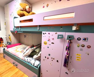 Vendo splendida cameretta completa da bambina con letto a castello, acquistata due anni fa presso un noto mobilificio di zona, in ottime condizioni, colori lilla e verde acqua, allegra e funzionale, perfetta per ottimizzare gli spazi.