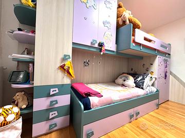 Vendo splendida cameretta completa da bambina con letto a castello, acquistata due anni fa presso un noto mobilificio di zona, in ottime condizioni, colori lilla e verde acqua, allegra e funzionale, perfetta per ottimizzare gli spazi.