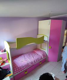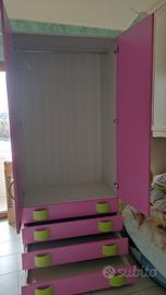 Vendesi cameretta da bambina marca Mondo Camerette, così composta : - armadio a due ante con 4 cassettoni, misure h 220cm - larghezza 90cm - profondità 60cm - angolo cabina armadio, misure h 256cm - profondità 96cm - letto a castello (materassi inclusi) con alla base due cassettoni+ 3 gradini laterali con cassetti, misure: lunghezza 2,51cm profondità 86cm - scrivania con tre cassetti, misure piano 120x60cm - libreria con due blocchi da tre quadrati da appendere alla parete come da immagini, misure: ogni blocco 90x30cm. Ritiro in loco