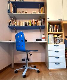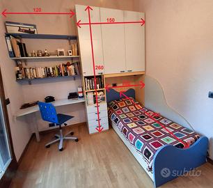 Composta da mobile armadio a ponte, letto 90x200 con rete a doghe, scrivania, sedia regolabile su ruote, tre mensole, colonna aggiuntiva 45x260, lampadario.