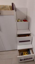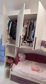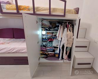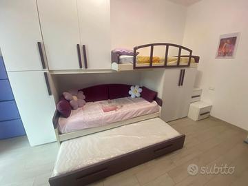 cameretta per Ragazza, Bimba o Bambina con 3 letti, di gran classe ed ottime rifiniture. Mobile color bianco molto robusto, con inserti viola senza segni evidenti di usura, tenuto con cura da una sola ragazza. La cameretta è composta da mobile a modulo alto che raggiunge i 2.60 mt ed è composto da 4 ante che misurano 130 x 50 cm e modulo basso a doppia anta che misura 132 x 100 cm. Il letto superiore è accessibile da tre scalini a cubotti che sono anche un ottimo contenitore. Nella parte bassa ci sono altri 2 letti con rete a doghe di cui uno a vista ed uno a scomparsa. Il terzo a letto a scomparsa ha il sistema di rialzo a molle così una volta aperto rimane alla stessa altezza di quello a vista. Tutti i letti misurano circa 200 cm x 92 cm. La lunghezza totale del mobile frontale è di 4 metri è l'altezza massima è di 2.60 metri mentre il lato più profondo è dato dai 3 scalini che arrivano ad 1 metro e 15 cm di profondità x 50 cm di larghezza. La cameretta si fornisce con un solo materasso. Il prezzo della cameretta nuova era di oltre 2000 euro. La cameretta è stata completamente smontata ed ogni pezzo è stato catalogato per il facile rimontaggio. NON è prevista la spedizione quindi chi la compra deve venire a prendersela in zona GENOVA con un furgone abbastanza capiente. Se avete domande su qualunque cosa contattatemi. Grazie