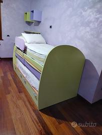 - blocco letto lung. 200cm x larg. 105 cm x alt.121 cm con 2 letti + 2 scrivanie esteaibili+2 cassettoni contenitore+2 cassetti sotto scrivanie+sponda