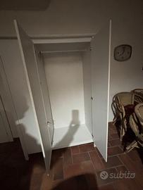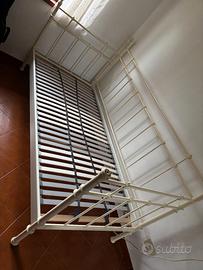 Cameretta per bambina/ragazza: Letto di metallo colore bianco buono stato con rete nuova a doghe, larghezza 90 cm, lunghezza 200; cassettiera bianca altezza 133, 45x49, 4 cassetti 34x20; armadio tre ante altezza 190, larghezza 130, profondo 55.