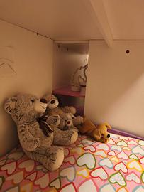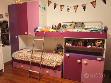 Cameretta bambine con doppio letto e rete per un terzo, con scrivania estraibile. Dimensioni: - lunghezza 3,50 m - altezza 2,45 m - profondità 88 cm Trasporto e smontaggio a vs carico.