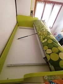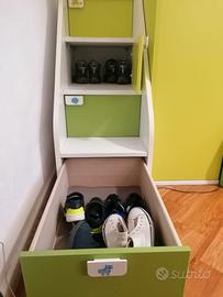 Due cassettoni sotto al letto a terra. Meccanismo di abbassamento letto superiore per facilitare il rifacimento del letto. Cassetti incassati nelle scale laterali. Armadi capienti compresi di scaffali, tubi appendi abiti e cassetti.