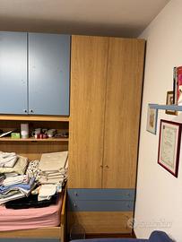 Vendo cameretta per bambini azzurra completa di scrivanie e mensole e materasso. Ampie cassettiere incorporate come da foto. Vendo senza trasporto e smontaggio. Disponibile da subito per qualsiasi domanda non esitate a contattarmi.