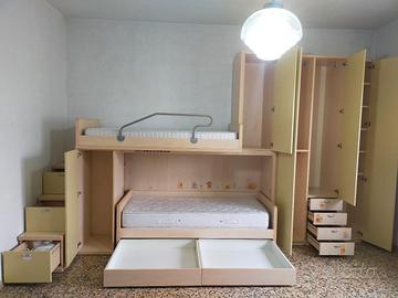 Salve!! Vendesi cameretta bambini completa di retti e materassi, di ottima qualità in ottime condizioni come da foto. Lunghezza totale 4,40x2,65H. Sendo componibile, si può montare anche separatamente. Compreso 4 mensole di tre diverse misure: 105-130-130-248L. Disponibile per il trasporto e montaggio. Grazie mille