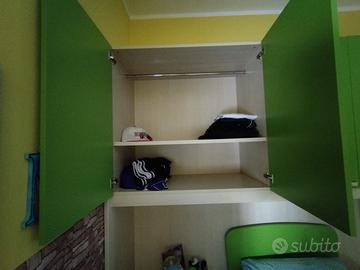 Bellissima cameretta per bambini, composta da armadio con ante, ripiani e cassetti; letto singolo con struttura robusta; comodino. I mobili sono in ottime condizioni e presentano un vivace colore verde e arancio.