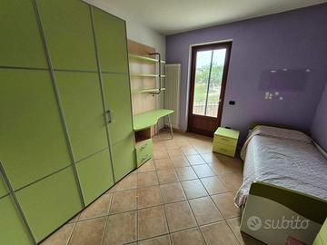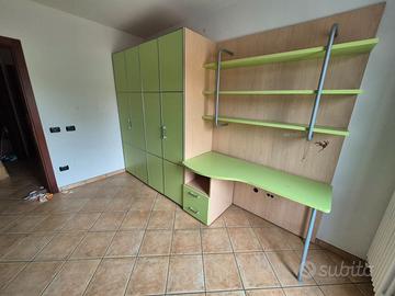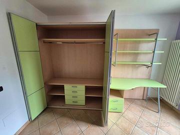 Vendo cameretta per bambini composta come in foto da armadio con ante a soffietto, mensole e cassettiera (lunghezza 180cm,altezza 228cm,profondità 65cm), libreria a parete (lunghezza 150cm, altezza 228cm), scrivania con cassettiera (lunghezza 150cm, profondità 50cm), letto (lunghezza 200cm, larghezza 90cm), comodino, tutto già smontato e pronto per essere portato via con furgone, rimontaggio a cura acquirente.