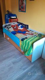 Cameretta due colori, arancione e beige chiaro con armadietto a ponte con letto doppio con materassi.