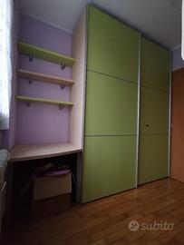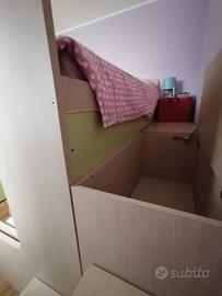 Cameretta in legno composta da 2 letti, di cui 1 con cassetti contenitori, struttura a castello con scala composta da cassetti contenitori, pedana con contenitori, reti letti e ampio armadio con 2 ante scorrevoli.