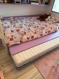 BELLISSIMA Cameretta Moretti Compact per bambini, 3 posti letto (due a castello, una branda a scomparsa), struttura finitura frassino bianco con particolari laccati colore lilla, composta da scaletta con cassetti (anta cassetti laccata colore lilla) e pedana con grandi mobili contenitori, pannello con mensola laccata colore lilla, letto a castello (letto superiore con protezioni laccate colore lilla), letto divano (con rete estraibile) completamente laccato colore lilla, con modulo armadio con cassettiere laccato colore lilla larghezza 145 cm, altezza 258 cm. COMPRESI 2 materassi 80x195, 1 materasso 90x200. Anno 2018, usata solo per una bambina, ottime condizioni. Disponibili ad inviare ulteriori foto se richiesto. Smontaggio e ritiro a carico dell'acquirente.