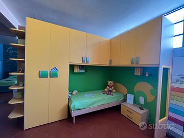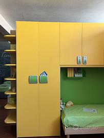 Cameretta dai colori giallo sole e verde cedro marchiata Moretti Compact. Composta da un letto singolo con rete 80x200, un comodino (L.63, P.40,7; H.35,7), un ponte angolare (L. 209,8 P. 157,3 H. 258), un armadio (L. 95 P.60 H. 258) con terminale open con mensole. 📌Per maggiori informazioni scrivici su mobilisile@gmail.com o passa nel nostro show room presso Mobilificio Sile, Silea (TV). Nel prezzo sono esclusi: -trasporto e montaggio - materasso