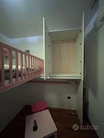 Camera soppalco bambini, con letto soppalco misure standard, scala contenitore e corridoio contenitore utilissimo per cambio stagione, ampio armadio a due ante, n.2 mensole lunghezza cm 180, oblò sotto scala, dove possono essere inserite scrivania o altri due letti, acquistata a “Pensare Casa” . Colore bianco, verde calypso e rosa baby, usata pochissimo in perfette condizioni, trasporto a carico dell’acquirente.