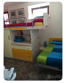 Vendesi cameretta bambini usata pochissimo composta da due letti, cassettiera con scrivania a scomparsa e piccolo armadio, scalette con contenitori molto ampi per riporre piumoni cuscini ecc.