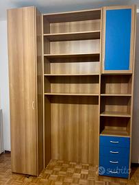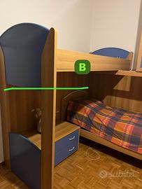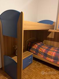 Cameretta bambini/ragazzi Composta da: 2 letti completi di rete a doghe Per il letto sospeso è inclusa la scaletta e parapetto Misure struttura: 90 x 200 cm Misure materassi: 80 x 190 cm (non inclusi) Parete A: Lunghezza: 250 cm Altezza: 260 cm Profondità: armadio laterale e sospeso 60 cm Parete B: Lunghezza: 200 cm Profondità: 90 cm Parete libreria + armadio: Lunghezza: 190 cm Profondità armadio: 60 cm Profondità mensole + cassetti + anta: 37 cm La cameretta presenta qualche segno di usura. Ritiro a carico dell’acquirente