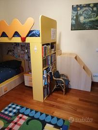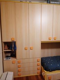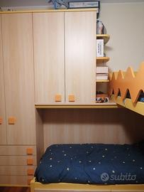 Arredamento completo per camera bambini composto da 2 letti sovrapposti, 2 comodini, armadio a 5 ante con cassettiera, libreria integrata, scrivania con 2 sedie, 2 ripiani a cubi da parete. Altezza max 262cm, armadio + letto in basso 388cm, letto in alto 200cm + scaletta 94cm, scrivania 190cmx61cm altezza 77cm.