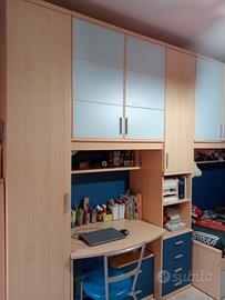 Cameretta faggio con colori azzurro cielo e blu. Composta: Ponte angolare con due letti singoli di cui un letto con due contenitori, più due comodini, scrivania e cassettiera quattro cassetti. Misure: larghezza CM 480, altezza CM 256, profondità 58 CM.