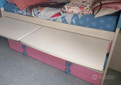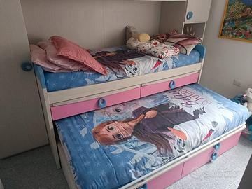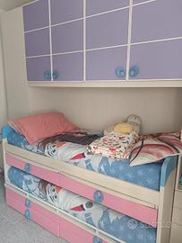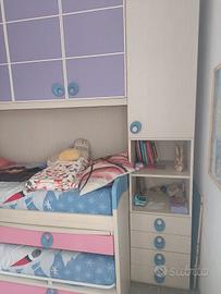 Cameretta compatta con due letti ad una piazza di cui uno scorrevole. Dirci cassetti, due scrivanie estraibili e sei ante. Lunghezza 3 metri, profondità 92 centimetri e altezza 2,60 m. Smontata e tenuta in una casa di campagna con facile accesso per il ritiro.