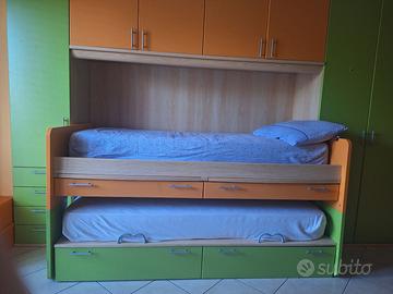 Vendo cameretta per bambini cosi composta: doppio letto a ponte estraibile con cassettoni e due scrivanie estraibili, a destra armadio a due ante sopra/sotto, a sinistra anta e 4 cassetti (vedi foto).