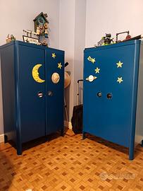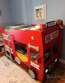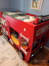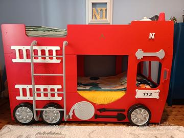 Vendo cameretta bambini a tema pompieri, composta da un letto a castello a forma di camion dei pompieri, due armadi con un ripiano e sopra spazio per appendiabiti, e un como con due cassetti.