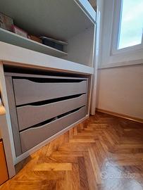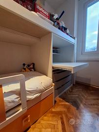 Vendo cameretta bambini SENZA letto sotto, misure L351xH260xP91. La cassettiera originale è stata sostituita con inserto da armadio come da foto e sopra è presente un vano scrivania estraibile