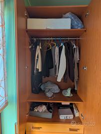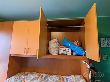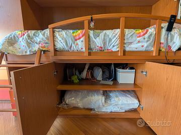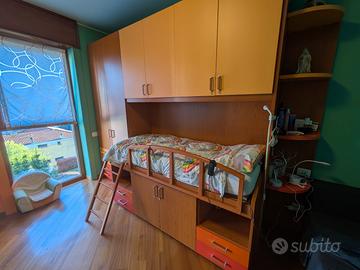 (S)vendo, per cambio casa, cameretta per bambini di entrambi i generi, con letto a ponte integrato, una colonna armadio larga 100 cm che comprende spazioso vano appendiabiti, due ripiani e quattro cassetti, nonché numerose aree riponi oggetti e abiti, in parte chiusi con ante e in parte aperti. Dimensioni: larghezza 342 cm, profondità 96 cm, altezza 260 cm. Rete letto e materasso non inclusi nella vendita. Smontaggio e trasporto a carico dell'acquirente.