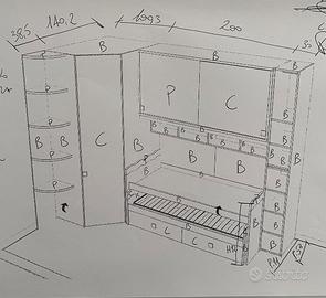 Cameretta con due letti, armadio a ponte, cabina armadio angolare, libreria e mensole